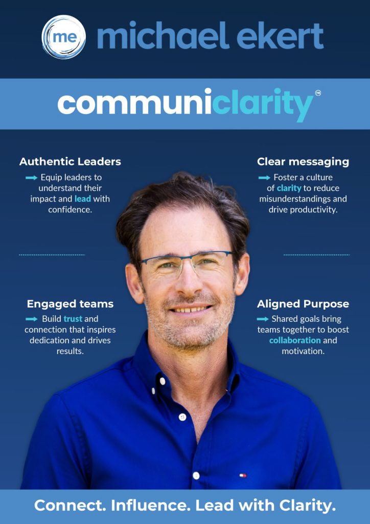 Michael Ekert is a dynamic and engaging speaker who simplifies communication through his Communiclarity® model. He knows how important communication is — and how often it goes wrong. Michael created Communiclarity to give leaders and teams practical strategies and easy-to-apply tools for clear, focused communication that drives results.